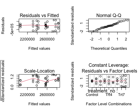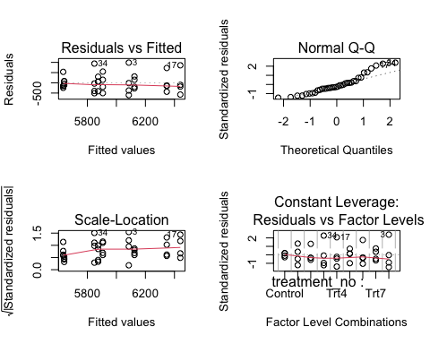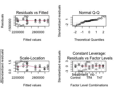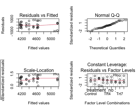 # Check model fit par(mfrow=c(2,2)) plot(Trait1$OverallSites_MixModel$model)