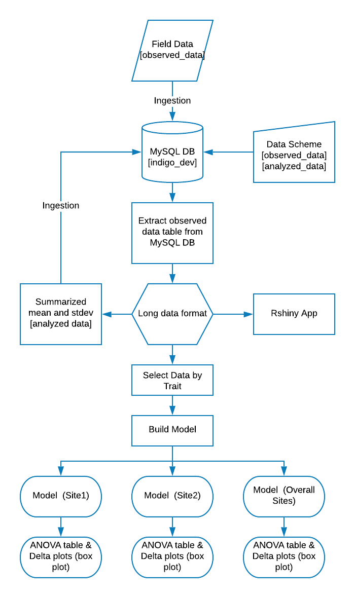 At first, data schema for the observed and analyzed data were created in MySQL. Data schema were created based on the column headers from the observed data (i.e. the provided data). For saving the relevant information from the analyses, I decided to store average effect of the treatments per site for both the traits in the data table "analyzed_data". This table will be generated as a part of the analyses and will be ingested into the MySQL database ("indigo_dev").
